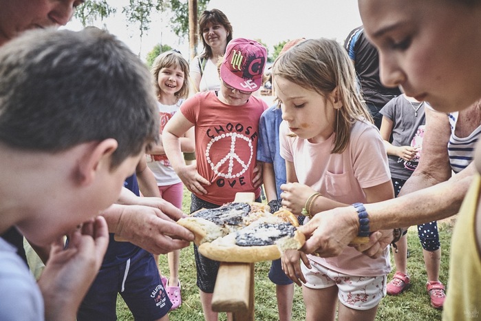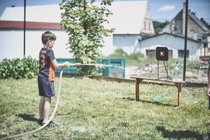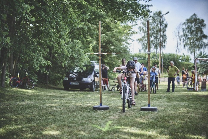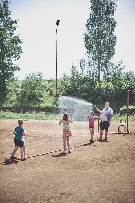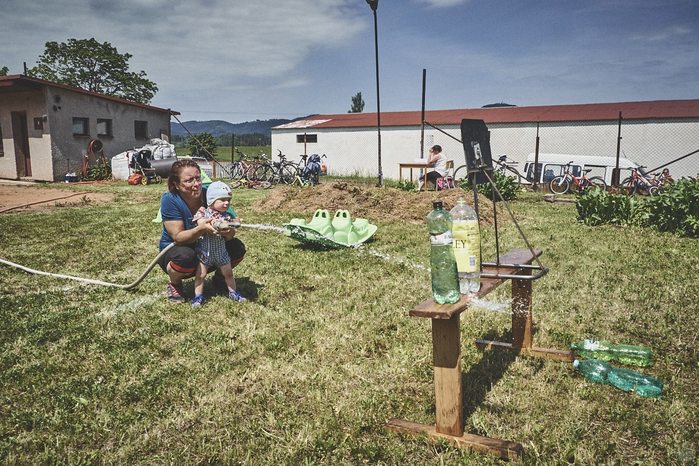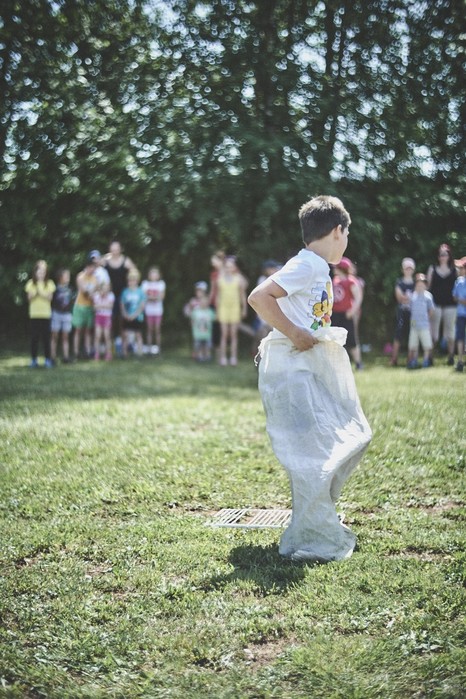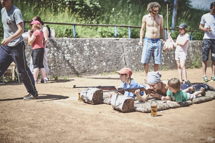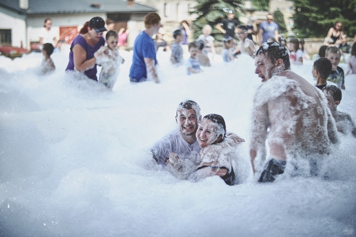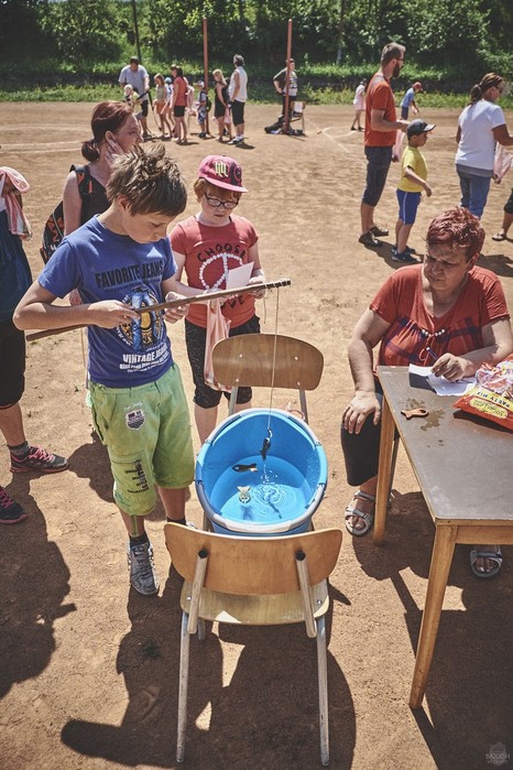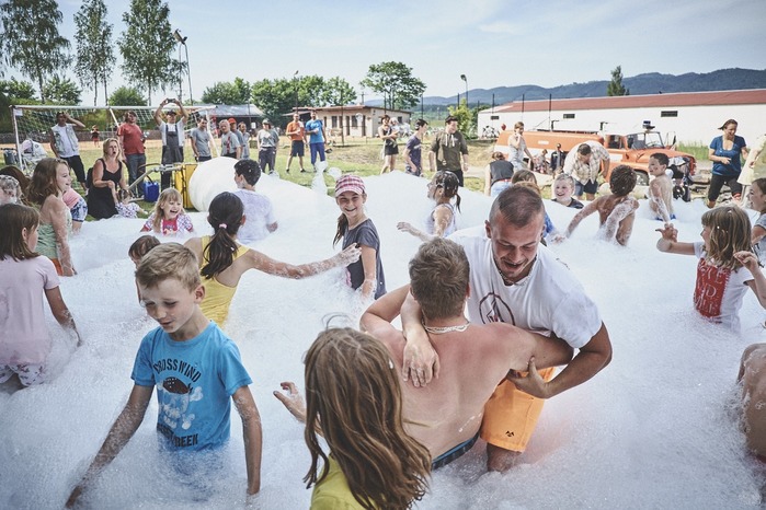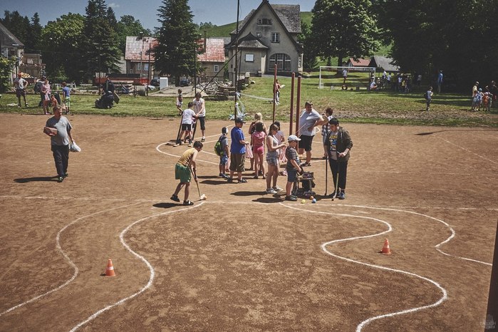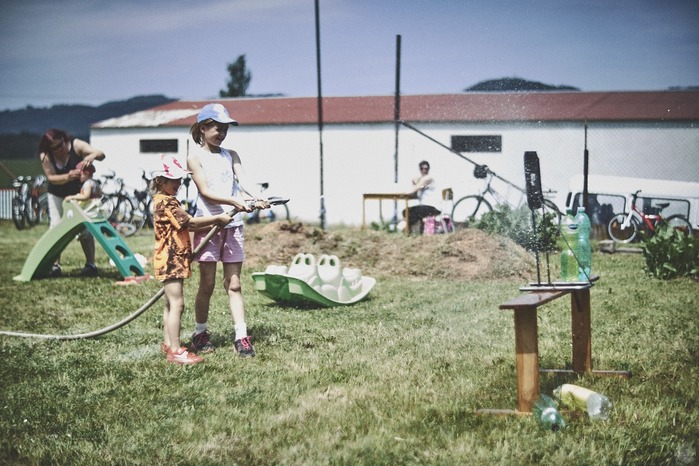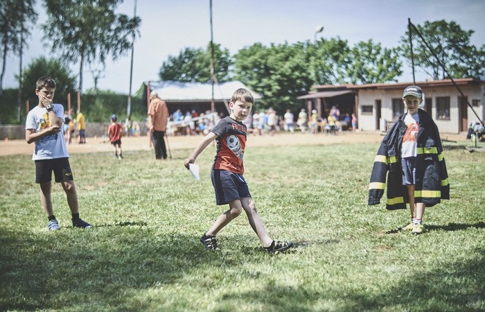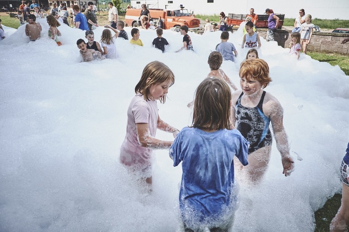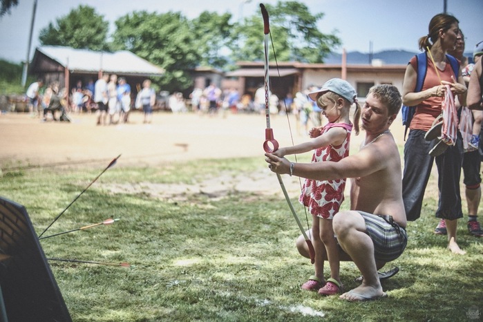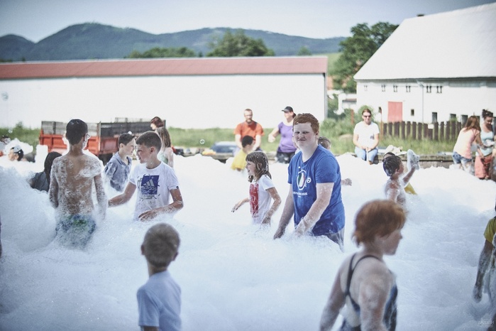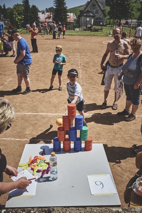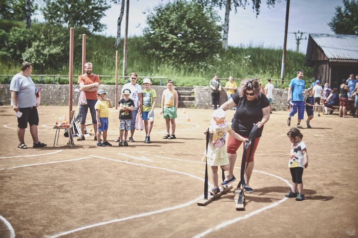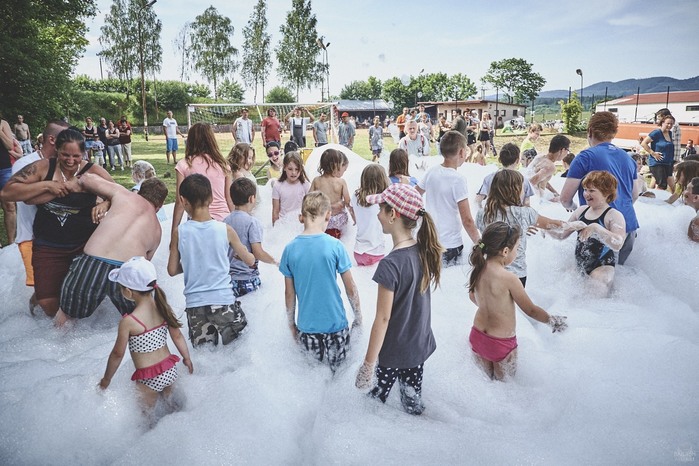 V čem mohly děti soutěžit? Inu, když něco funguje, tak proč to nějak obšírně měnit. Takže akce se neobešla bez letitých atrakcí jako je trefování plastových soudků a klauna, lovení rybiček, slalomu na lyžích pro dva, střílení ze vzduchovky, stříkání ze džberovky, skládání pexesa nebo slalomu s floorbalovou hokejkou mezi kuželkami. Jako minulý rok se opakovala úspěšně překážková dráha BESIP pro koloběžky, kola a odstrkovadla. Letos se ale děti tak dobře nepřipravily a nedovedly si své vlastní dopravní prostředky. I přesto všechny nějakým způsobem dráhu dokázaly absolvovat. Také se střílelo z luku, což je dlouhodobě jedna z nejoblíbenějších akvizic našeho ansáblu. Pila se dlouhými brky malinovka ve dvojicích a děti si mohly použitá dlouhá brka nechat, ale jejich neskladnost stejně vedla k tomu, že jich spousta skončila v koších na odpadky. Přes počáteční upejpání se nakonec děti odhodlaly i k účastem na tradičním prožírání se koláčem. Letos mile překvapilo, že u skákání v pytlích ve trojicích hojně zastupovali své ratolesti i tatínci a řekl bych podle vlastního pozorování, že se jim to velice líbilo. Možná bychom měli oprášit letitý nápad uspořádat v USA velice populární Den otců, který se pravidelně slaví v červnovém měsíci a otcové soutěží ve dvojicích se svými dětmi. Děti pomalu unavovalo slunce natolik, že ty menší už pomalu usínaly. Něco málo zpravilo kropení antuky, které děti využívaly hojně ke svému ochlazení a bavilo je běhat pod krůpějemi vody z hadice. Vrchol celé akce ale byl, když hasiči úspěšně natočili dětem pěnu a děti si ji užily tak jako nikdy. Poté se rády nechaly zkropit z vodního děla, až vzniklo na louce docela slušný bahýnko a některá čuňátka se v něm ráda porochtala. Naštěstí poblíž stáli rodiče, které je včas zarazili a pak začal koloběh oplachování a sušení.
