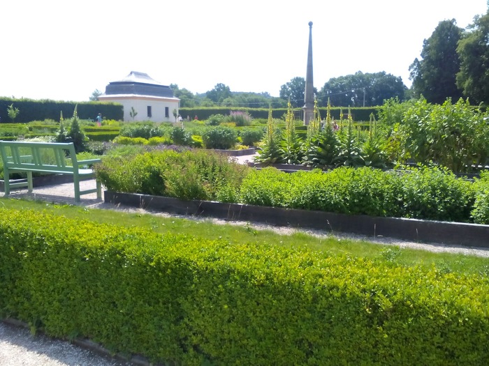 Po prohlídce bylo ještě dost času na procházku po nádherné bylinkové zahradě. Pravidelný půdorys, štěrkové cestičky, pečlivě střižený zimostráz, celá řada známých i neznámých bylinek, obří obelisky a sochy. Zámecká zahrada na Loiře? Kdepak, tohle je špitální bylinková zahrada v Kuksu. Velký křesťanský bojovník uprostřed a další sochy byly do bezpečí zahrady přeneseny z Braunova Betléma.